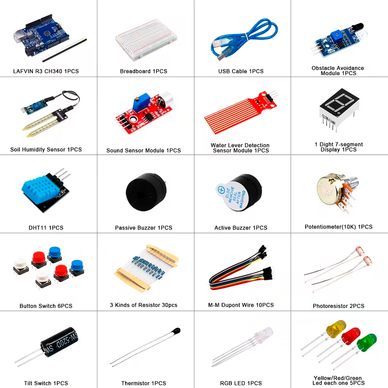 Desde encender tu primer LED hasta crear un sistema inteligente de evitación de obstáculos, este kit te guía paso a paso gracias a su código de tutorial incluido. Es la herramienta ideal para proyectos escolares, prototipado rápido o simplemente para descubrir cómo funciona la tecnología que nos rodea. ¡Todo lo que necesitas para empezar a inventar está en esta caja!
