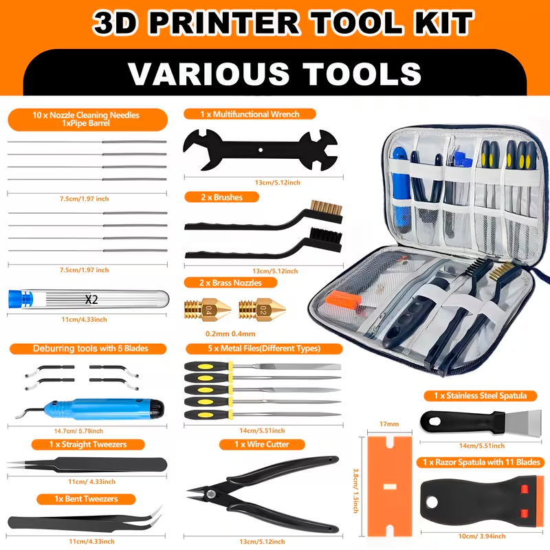 Te encantará porque es la navaja suiza de la impresión 3D. Ya no tendrás que buscar herramientas sueltas por toda la casa o el taller; este kit centraliza todo lo que necesitas en un solo lugar. Te da la confianza necesaria para enfrentarte a cualquier atasco de boquilla y la libertad creativa de pulir tus piezas hasta que queden perfectas. Es la inversión más inteligente para prolongar la vida útil de tu impresora y elevar la estética de tus creaciones.