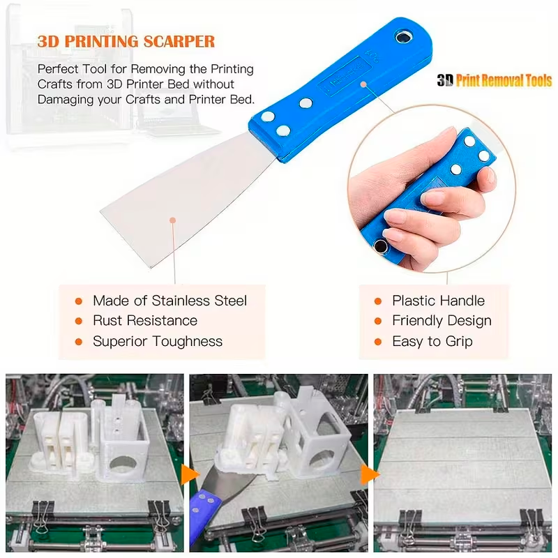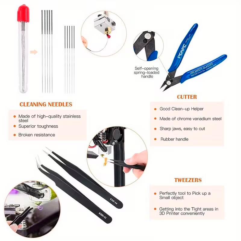 Limpieza Especializada: Cepillos de alambre y agujas de limpieza diseñados para eliminar residuos de filamento sin dañar los componentes de la impresora.