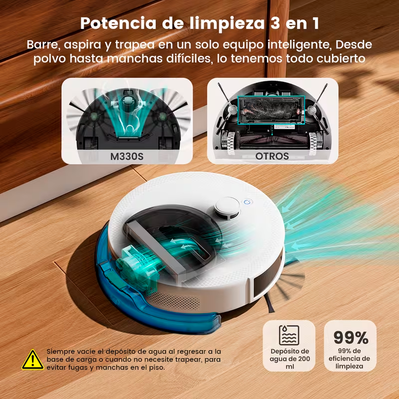 Te encantará porque el M330S ofrece el rendimiento de un robot de alta gama en un formato ideal para tu día a día. Es increíblemente satisfactorio ver cómo gestiona los obstáculos de forma inteligente mientras tú te olvidas de barrer o pasar la fregona. Si tienes mascotas, te fascinará cómo mantiene a raya los pelos en las alfombras, garantizando un ambiente limpio y saludable con solo pulsar un botón en tu móvil.