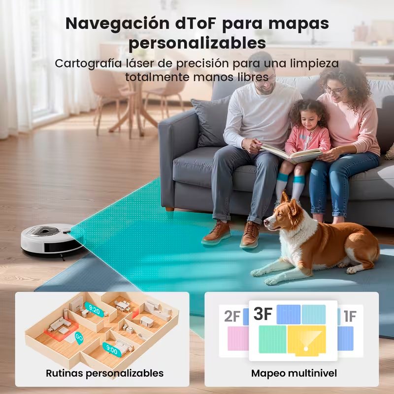 Navegación Láser Inteligente: Mapea tu hogar con precisión para una limpieza ordenada, evitando repetir zonas o dejar espacios sin cubrir.